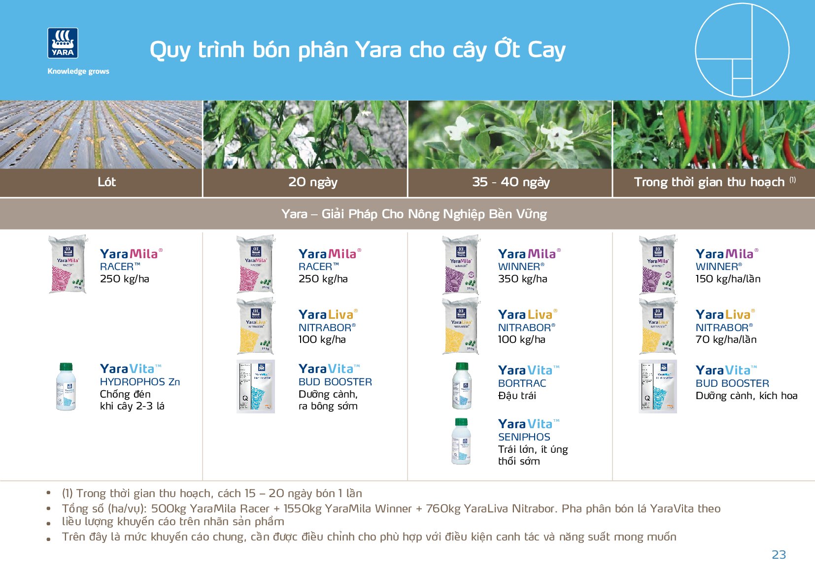 Tuyên bố miễn trừ trách nhiệm: Đối với kiến thức và sự hiểu biết tốt nhất từ phía Yara, thông tin trong tài liệu này là chính xác kể từ ngày biên soạn. Tuy nhiên, Yara không tuyên bố, bảo đảm hoặc cam kết về độ chính xác, độ tin cậy, tính đầy đủ, tính kịp thời và hoặc sử dụng của thông tin. Trách nhiệm của người dùng là xác định phù hợp và đầy đủ thông tin này đối với mục đích sử dụng hoặc mục đích cụ thể của người dùng. Nội dung thông tin phải được điều chỉnh cho phù hợp với điều kiện địa phương và người dùng phải luôn đọc nhãn hiệu cho từng sản phẩm trước khi sử dụng. Yara không nhận bất kỳ trách nhiệm pháp lý nào đối với bất kỳ tổn thất hoặc thiệt hại nào có thể xảy ra từ bất kỳ việc sử dụng thông tin này